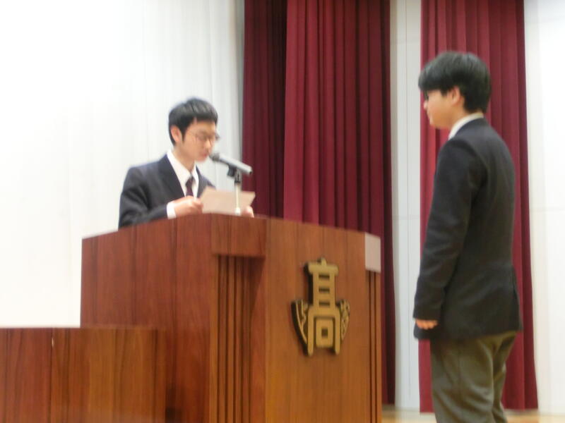 12月1日(月)全校集会に先立ち、「税に関する高校生の作文」で優秀賞を受賞した2年生多田幸生さんの表彰伝達式を行いました。集会では、今月の目標が「行事ぶち上げ、日常落ち着け」に決まりました。24日には冬季球技大会が開催されます。この日は、毎年PTAの皆さんが豚汁を作りに来てくれます。ありがとうございます。校長講話では「高校時代の失敗や悔しい思いが今の自分をつくりあげた」というお話で、皆を励ましてくださいました。