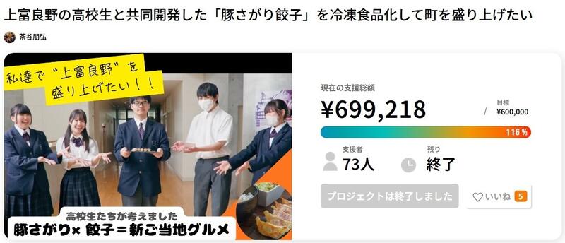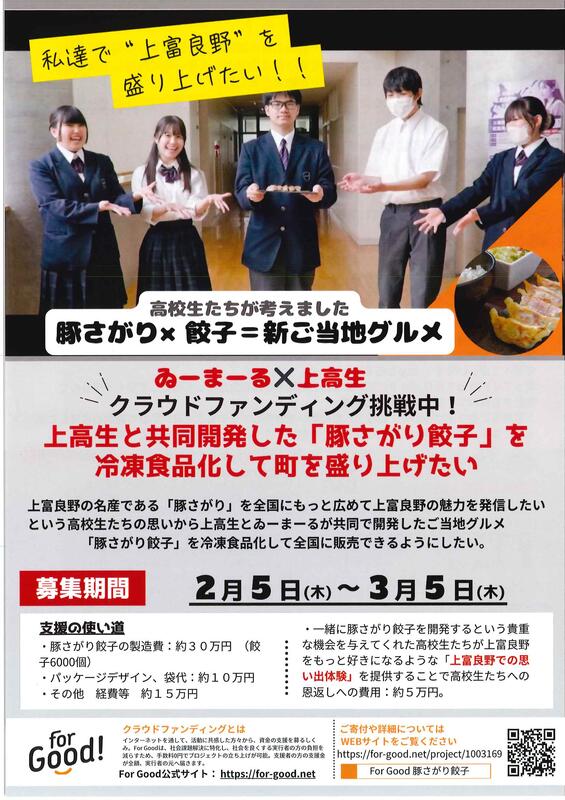 地域探究での活動から始まった「豚さがり餃子」を全国に広めるため、クラウドファンディングが始まりました。詳細はチラシをご覧ください。多くの皆様のご協力をお願いします!