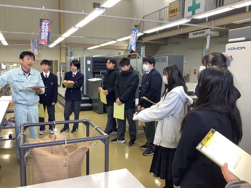専門学院では、システム制御技術科・自動車整備科・印刷デザイン科など全学科の授業を見学。印刷デザイン科の学生が作ったメモ帳やノートをいただき、生徒たちは喜んでいました。