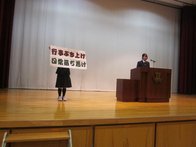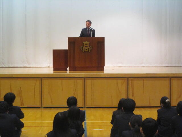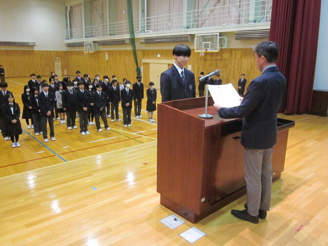 12月1日(月)全校集会に先立ち、「税に関する高校生の作文」で優秀賞を受賞した2年生多田幸生さんの表彰伝達式を行いました。集会では、今月の目標が「行事ぶち上げ、日常落ち着け」に決まりました。24日には冬季球技大会が開催されます。この日は、毎年PTAの皆さんが豚汁を作りに来てくれます。ありがとうございます。校長講話では「高校時代の失敗や悔しい思いが今の自分をつくりあげた」というお話で、皆を励ましてくださいました。